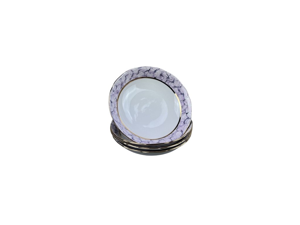 Tato 4dílná kompotová souprava pro šest osob je skvělou volbou pro ty, kteří chtějí přidat umělecký prvek do svého stolování. Souprava se vyznačuje elegantním dekorem imitujícím mramor, který je proveden technikou listru, přinášející unikátní vzor ve fialových a bílých tónech na každém z kusů.