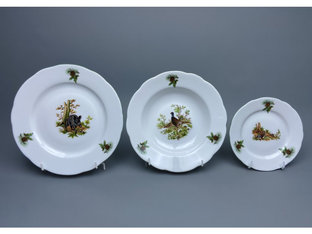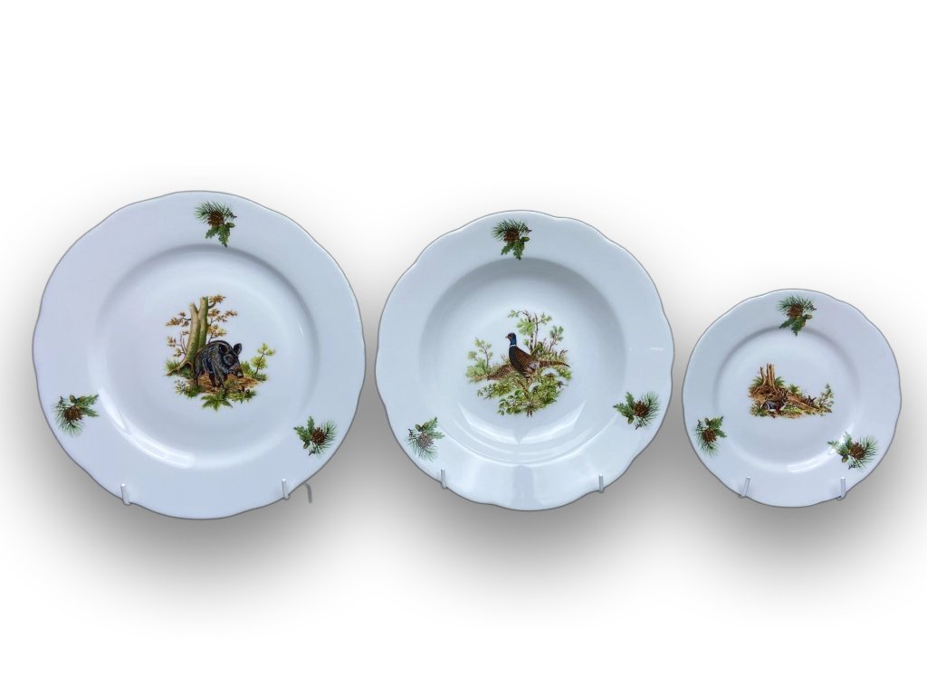 Přeneste kouzlo přírody a lesní romantiku přímo na váš jídelní stůl s touto talířovou soupravou pro 6 osob, která je zdobena nádherným mysliveckým motivem. Každý kus této sady ožívá detailně zpracovanými obrázky lesní zvěře, které jsou obklopeny bujnou zelení, a vytváří tak neopakovatelnou atmosféru pro vaše rodinné i slavnostní stolování.