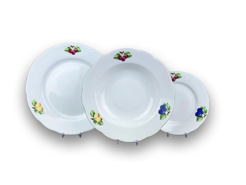 přináší radostný motiv ovoce doplněný decentní zelenou linkou na vlnitě tvarovaném okraji. Kombinace sytých barev ovoce a čistě bílého porcelánu navozuje útulnou atmosféru domova a hodí se skvěle jak pro každodenní použití, tak i slavnostnější příležitosti.