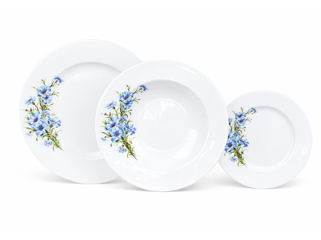 Souprava je zdobena jemným květinovým dekorem chrp, který dodává nádobí elegantní a zároveň přírodní vzhled. Bílé porcelánové talíře s modrým květinovým motivem působí velmi svěže a jsou vhodné jak pro každodenní stolování, tak pro slavnostní příležitosti.